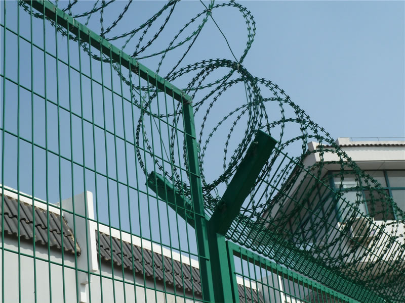 監(jiān)獄護(hù)欄網(wǎng)現(xiàn)被廣泛應(yīng)用在監(jiān)獄,軍事基地等高安全場(chǎng)所。注:如果在監(jiān)獄護(hù)欄網(wǎng)頂部加裝刀片刺絲、刀片刺繩后又很好的增強(qiáng)了安全防護(hù)性能。采用電鍍、熱鍍、噴塑、浸塑等防腐形式,具有很好的抗老化、抗曬、耐候等特點(diǎn)。其產(chǎn)品造型美觀、花色多樣,既起到圍欄作用,又起到美化作用。由于具有安全性高、防攀爬能力好,網(wǎng)片連接方式采用SBS緊扣件,有效防止人為的破壞性拆卸,橫向四道折彎加強(qiáng)筋,使網(wǎng)面強(qiáng)度大大增加。